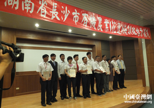 6月11日下午,結業儀式上,湖南省長徐守盛、副省長何報翔、長沙市市長張劍飛和花蓮縣縣長傅琨萁共同為長沙市有機農業(花蓮)培訓班學員代表頒發結業證書。(圖片來源:湖南省臺辦)
