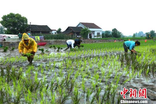 7月5日,湖南常德澧縣城頭山旅遊景區的田間地頭里,當地農民正在臺灣稻田彩繪專家團隊的指導下有序插秧。他們將在這片稻田里用五色水稻“繪制”一幅面積達50畝的巨型創意稻田彩繪圖案。