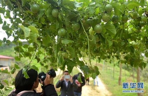 12月1日,遊客在廣西欽州欽南臺灣農民創業園觀賞百香果。