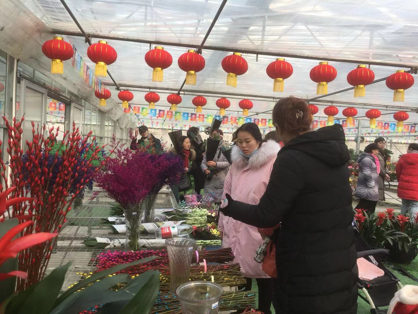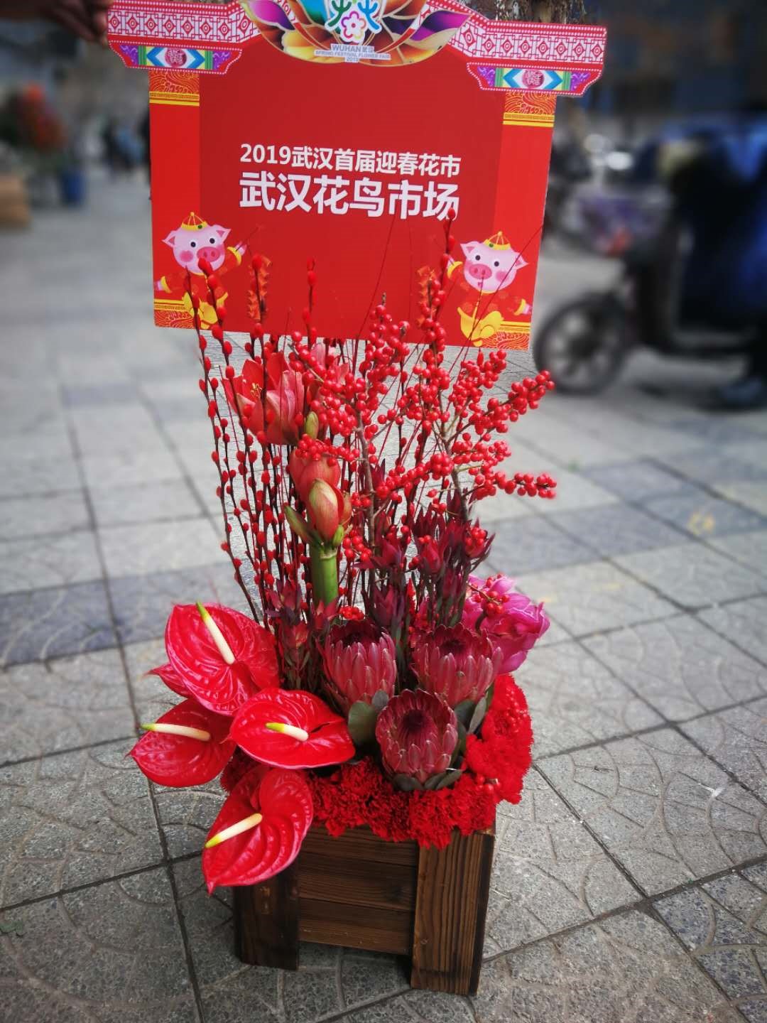 球場路武漢花鳥市場迎春花市分會場,帶來冬青,銀柳,公主,朱頂紅,紅掌,大花卉蘭,康乃馨組成的迎春花箱,寓意新年祈盼,富貴吉祥,紅紅火火過大年。(圖片來源:黃陂臺創園)