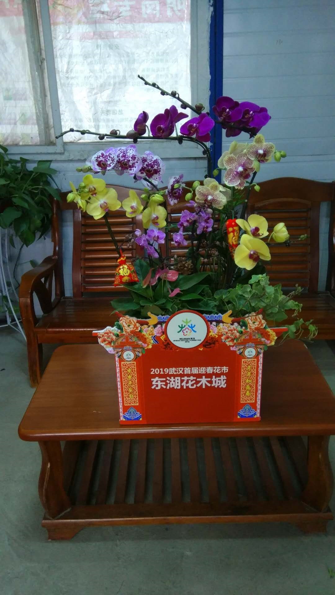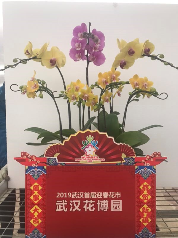 武漢東湖花木城迎春花市分會場,帶來由:大辣椒、富樂夕陽、彩蝶1861、金孔雀、聖地亞哥、茱莉、常春藤、袖子椰子組合而成的蝴蝶蘭祝福花箱,寓意:花開富貴、福如東海、碟舞新春。結語:迎春花市為您幸福生活添姿彩。(圖片來源:黃陂臺創園)