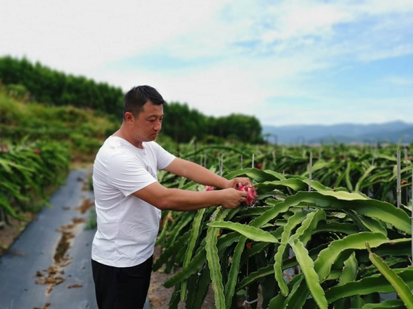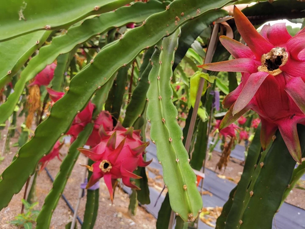 這兩個品種為臺灣高優新品種紅心火龍果,這批苗是去年四月下地種植種的,去年秋天已經試產。到了今年就大量挂果,在田間,同一棵樹上同時挂有三期果,紅果、青綠果還有小果,陳燕鳳介紹說,紅的是今年第一批果,到目前已經基本採摘完畢,再接下來就可以採摘第二第三批果,一直可以收到國慶節。這一批來自臺灣的“軟枝大紅”和“紅寶龍”兩個品種品質優良,不但挂果早、產量大而且果大、肉質好、甜度高,口感非常好,一投入市場就受到客戶的追捧。目前該公司的火龍果已經進入福建省知名大超市銷售,擺上了精品水果的櫃臺,正在往“高、大、上”方向努力邁進。