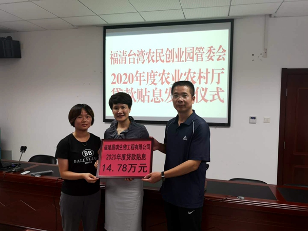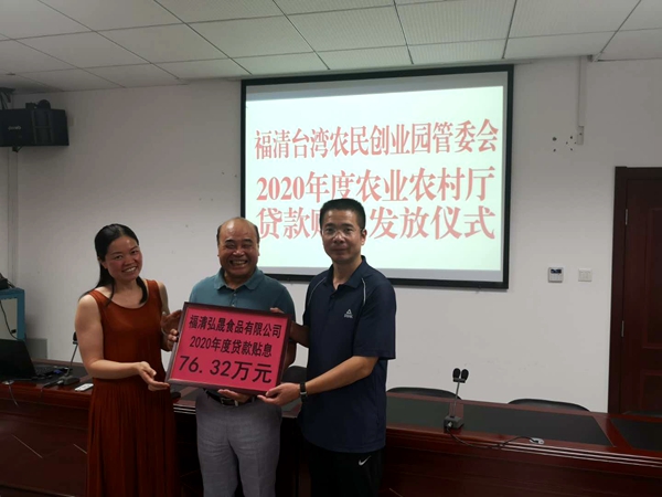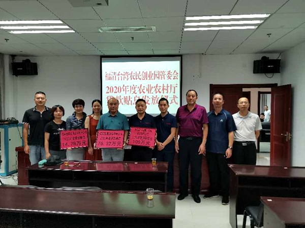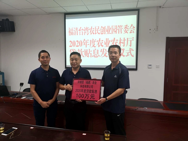 海峽兩岸農業合作網訊 8月下旬,福州福清臺灣農民創業園舉行2020年度農業農村廳貸款貼息發放儀式。本次共為園區3家臺資農業企業發放貼息資金191.1萬元。