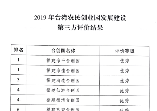 海峽兩岸農業合作網訊 日前,國家農業農村部辦公廳、國務院臺灣事務辦公室秘書局公布了一年一度的全國臺灣農民創業園發展建設第三方評價結果,漳浦臺灣農民創業園保持優秀等級,並獲得全國參評的28個臺創園中綜合得分並列第一名。這也是漳浦臺創園首次在該項權威綜合實力考評中獲得第一名,比去年排第六名晉升了五位。