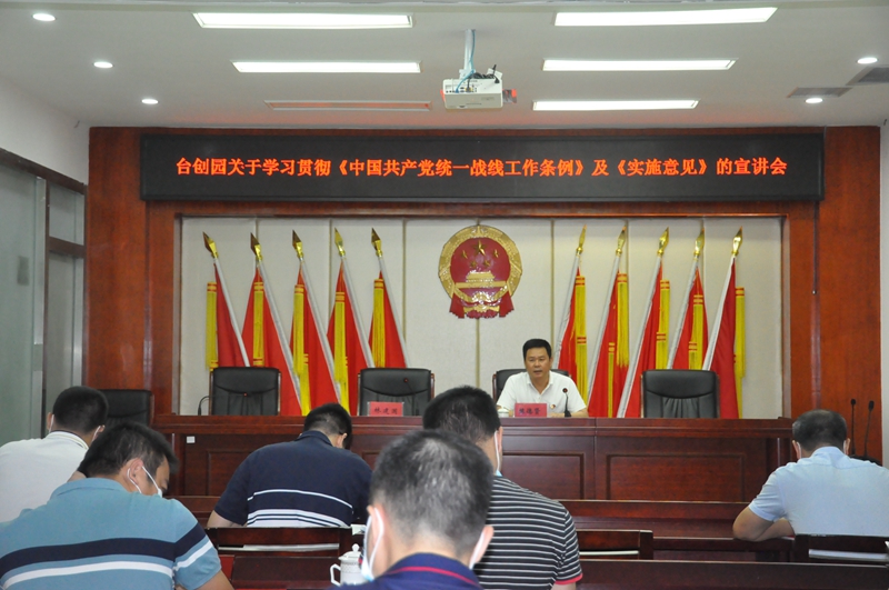 海峽兩岸農業合作網訊 為深入推進黨史學習教育,學習貫徹習近平總書記在慶祝中國共產黨成立100周年大會上的重要講話精神,9月1日下午,《中國共產黨統一戰線工作條例》及《實施意見》宣講會在漳浦臺創園三樓會議室召開。漳浦三級調研員陳德賢作宣講報告,臺創園主任林建國主持會議並講話,參加會議的有臺創園全體幹部職工及各黨支部書記。