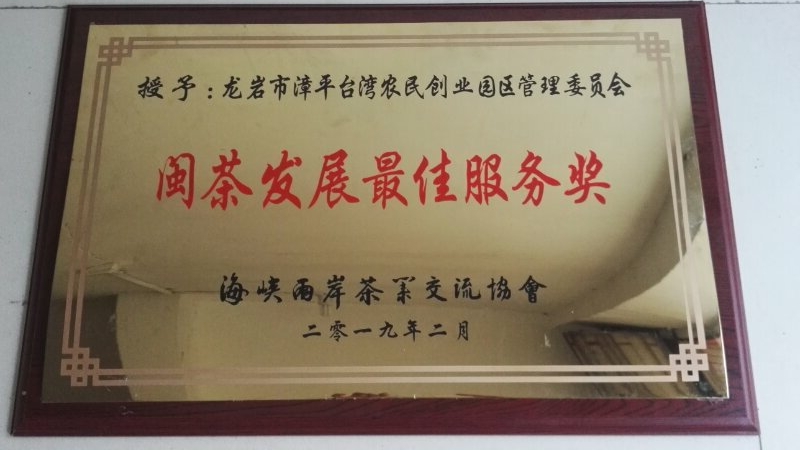 閩茶發展最佳服務獎牌匾。(圖片來源:漳平臺創園)