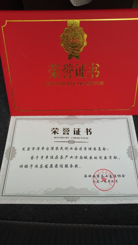 閩茶發展最佳服務獎榮譽證書。(圖片來源:漳平臺創園)