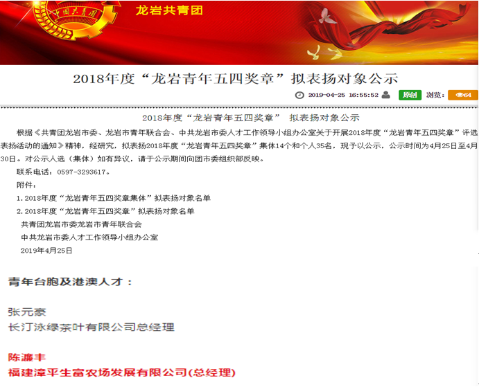 陳濂豐榮獲2018年度龍岩青年五四獎章截屏。(圖片來源:漳平臺創園)