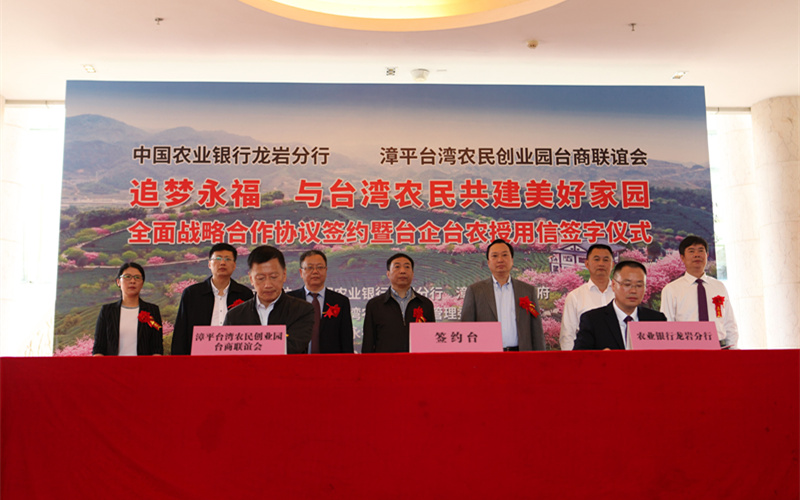 海峽兩岸農業合作網5月10日漳平訊 立夏之初、新茶吐綠。5月9日,農行福建龍岩分行與龍岩市臺灣同胞投資企業協會漳平聯誼會戰略合作協議簽約暨臺企臺農授用信簽字儀式在福建龍岩漳平臺灣農民創業園(簡稱漳平臺創園)核心區永福鎮成功舉行,通過拓展臺創園金融服務的廣度和深度,共同書寫閩臺農業合作新的篇章。