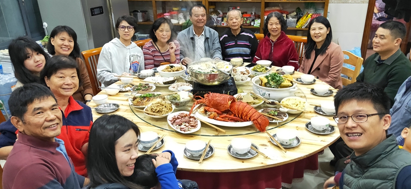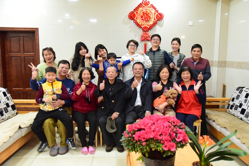 在臺灣,過年時不少家庭都會圍坐在有火鍋的圓桌上一起聚餐,叫做“圍爐”,寓意團團圓圓。同往年一樣,謝東慶與姐妹、弟弟每人做一道老父親喜食的家鄉菜,三杯雞、筍幹爌肉、炒魔芋等一盤盤臺灣和本地風味的菜肴擺滿圓桌,一家15人四世同堂,一起圍爐過除夕,一起看“春晚”,老父親喜笑顏開,和和美美地與滿堂子孫共享天倫之樂。