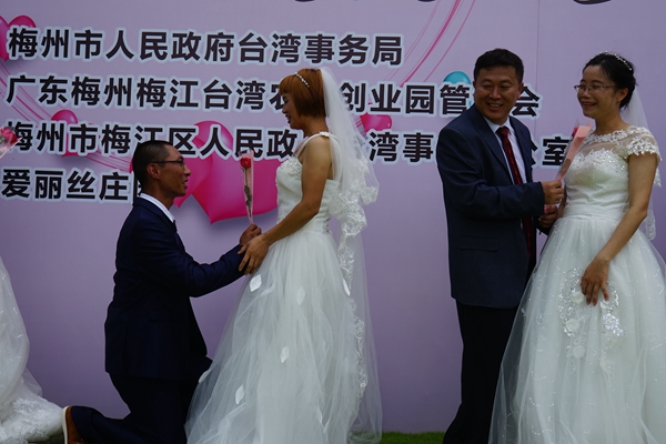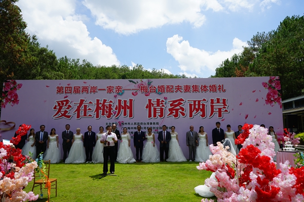 據了解,梅州是重要的“臺胞之鄉”,去臺人員一直以來佔全省第一位,祖籍梅州的臺灣客家人有180多萬人。從1988年海峽兩岸通婚以來,梅州市共辦理涉臺婚姻登記9000多對,是廣東省涉臺婚姻登記人數最多的市。此次“愛在梅州·情係兩岸”的集體婚禮,是由梅州市臺辦主辦,梅江臺創園、梅江區臺辦、愛麗絲莊園協辦。通過舉辦此次活動,拓寬做臺灣人心工作的渠道,進一步拉近梅臺兩地同胞的親情、感情和友情,對梅臺農業、經貿、文化等方面的交流與合作起到積極促進作用。(梅江臺創園管委會)