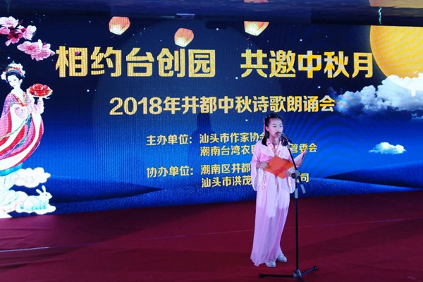 汕臺情,故鄉井。但願人長久,千里共嬋娟。詩歌朗誦會在幼兒舞蹈《好運來》中拉開序幕,詩歌朗誦、女聲獨唱、器樂合奏、男女大合唱、器樂演奏等等精彩節目,一曲曲旋律美妙動聽,一支支舞蹈別具特色,演唱者黃雯雯的《一壺好茶一壺月》,唱出了大家對中秋這個重要傳統節日寄予的無限情懷,朗誦者楊南玲一首娓娓道來的《鄉愁》,更是把兩岸關係,把現場觀眾的愛國思鄉情緒推向了高潮。潮南臺創園2018年迎中秋詩歌朗誦會,讓大家團聚一起抒發愛國愛鄉情懷,在傳統文化的熏陶中喜迎中秋佳節,在一陣陣熱烈的掌聲中圓滿落下帷幕。(潮南臺創園管委會)