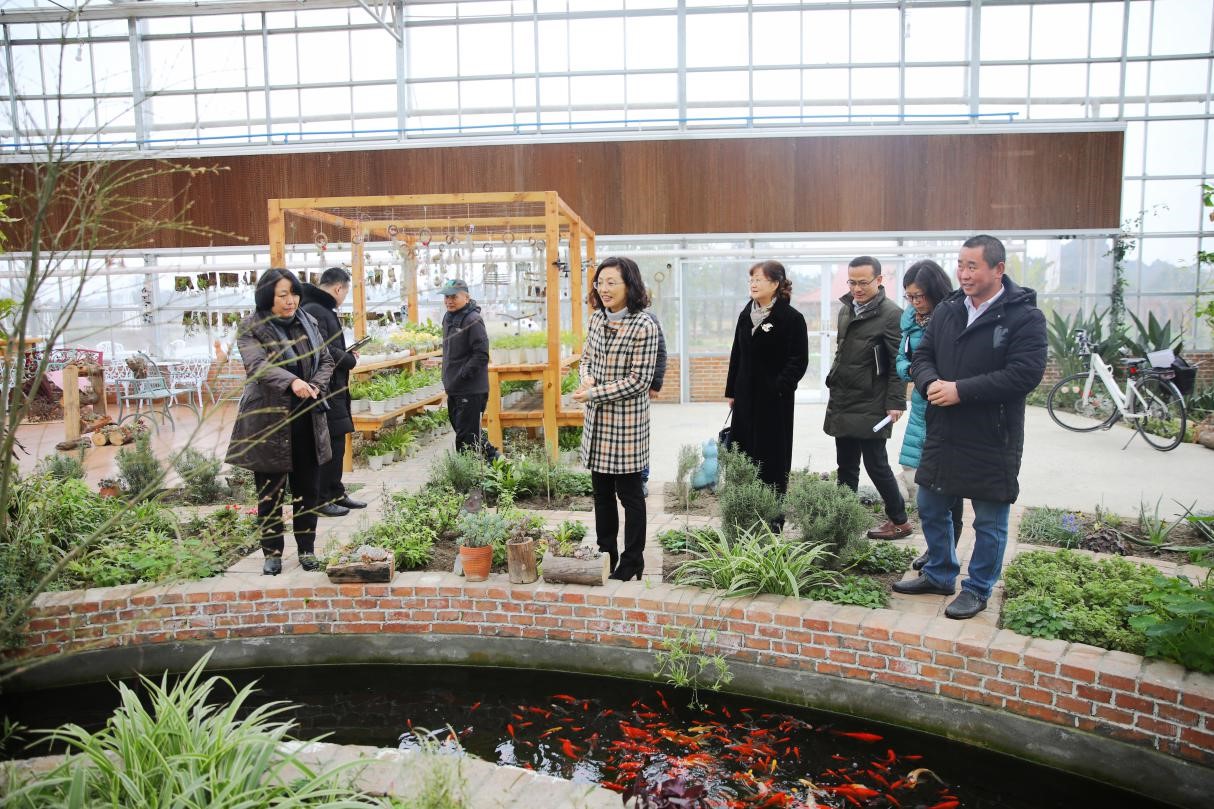蔣莉一行實地考察了桃園湖TINA莊園幹花、烘焙DIY教學區、兒童體驗區及循環農業(魚花共生)展示區。