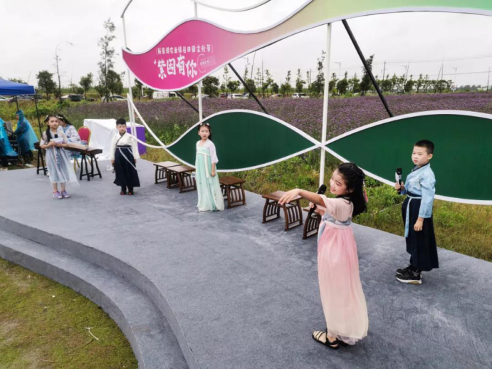 一群來自新浦鎮中心小學身著漢服的孩子們用稚嫩的聲音情景朗誦《踏春》,為我們展現了一幅古代兒童踏春圖。一段朗朗上口的《笠翁對韻》清脆悠揚,孩子們學習之後迎著春光爭相放紙鳶,伴著古詩《村居》唱響在花海之上。雖是夏季,但淅瀝的小雨讓遊人感覺這里仍是春天的花海。