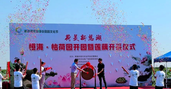 海峽兩岸農業合作網訊 9月5日,“荷美新慈湖”首屆荷花節開幕式在慈溪臺創園連片3500多畝荷花園區中心平臺舉行,慈溪市副市長董維波、浙江恆海投資集團有限公司周行春董事長為恆海怡荷園開園暨蓮藕開採敲鑼,慈溪臺創園園區管委會主任戚岳瑞在開園儀式上致辭。從微信平臺報名的遊客們不僅欣賞到了震撼的風景,還在荷塘里捉魚採蓮賺得盆滿缽滿,滿載而歸。