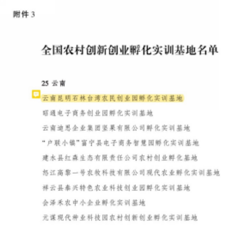 10年來,在縣委政府關心支持、管委會全體幹部職工及園區企業的共同努力下,石林臺創園創新創業環境持續改善、創業創新活力不斷激發,助推園區經濟發展,帶動周邊村民就業增收。2019年7月,臺創委結合實際並按照項目申報文件要求,精心組織人員開展全國農村創新創業孵化實訓基地項目策劃包裝,經不斷修改完善後上報市農業農村局,通過逐級審核、專家評審等程序,石林臺創園獲批為全國農村創新創業孵化實訓基地。(雲南昆明石林臺灣農民創業園管理委員會)
