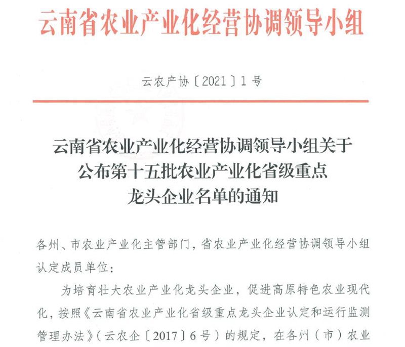 海峽兩岸農業合作網訊 近日下發的《雲南省農業產業化經營協調領導小組關于公布第十五批農業產業化省級重點龍頭企業名單的通知》(雲農產協〔2021〕1號 )顯示,石林臺創園入園企業石林連宏農林牧科技開發有限公司入圍第十五批農業產業化省級重點龍頭企業名單。