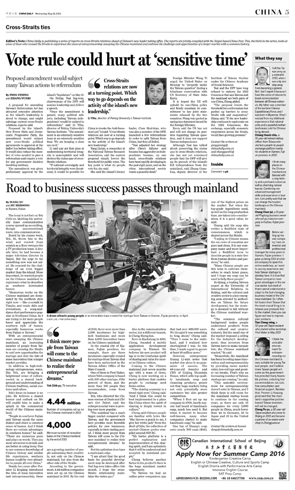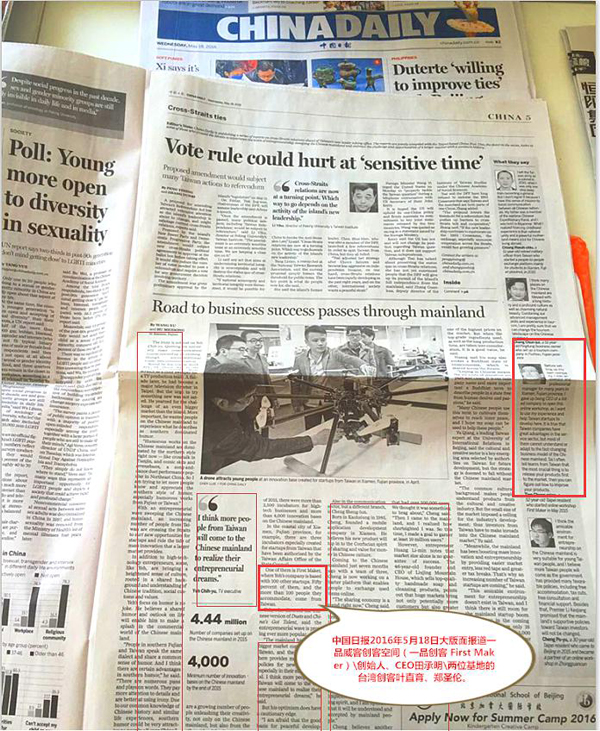 Nearly two years after Premier Li Keqiang introduced the idea of mass innovation and entrepreneurship during the summer Davos Forum in Tianjin, there is now echoing sound not only f rom the mainland, but also f rom the other side of the strait.