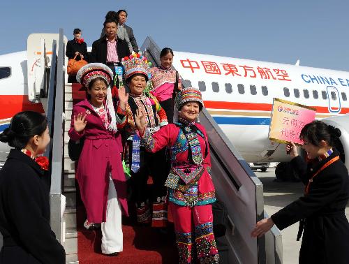 Deputies to the Third Session of the 11th National People's Congress (NPC) from southwest China's Yunnan Province arrive in Beijing, capital of China, March 2, 2010. The Third Session of the 11th NPC is scheduled to open on March 5. (Xinhua/Yang Zongyou) |