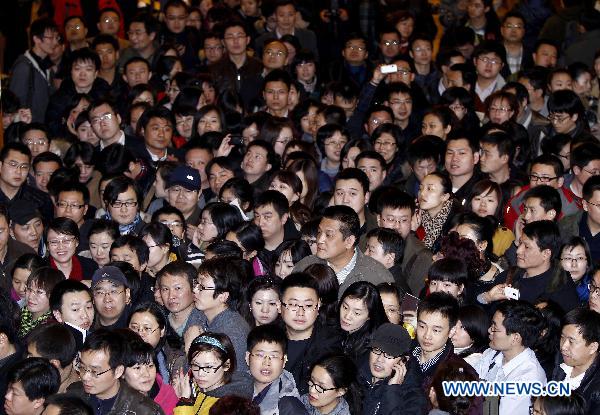 Journalists wait for information materials at an auditorium of Chinese People's Political Consultative Conference (CPPCC) in Beijing, capital of China, March 1, 2011. The Fourth Session of the 11th CPPCC National Committee will open in Beijing on March 3. (Xinhua/Chen Jianli) |