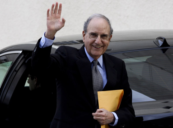 設設U.S. envoy to the Middle East George Mitchell waves to media upon his arrival to meet with Palestinian President Mahmoud Abbas in the West Bank city of Ramallah, May 8, 2010. U.S. peace envoy Senator George Mitchell arrived in Ramallah on Saturday evening for talks with Palestinian President Mahmoud Abbas to receive the Palestinian response over starting the proximity talks with Israel. (Xinhua/Fadi Arouri)