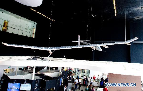 Photo taken on Oct. 12 shows a model of a solar-powered aircraft at Belgium-EU Pavilion in World Expo Park in Shanghai, east China. The solar-powered aircraft made the history record as it landed on July 8, 2010 at Payerne airbase in western Switzerland, after flying around the clock on the sun's energy alone. (Xinhua/Xu Jinquan)