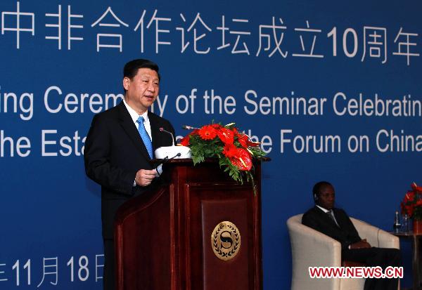 Visiting Chinese Vice President Xi Jinping delivers a speech at the opening ceremony of the Seminar Celebrating the 10th Anniversary of the Establishment of the Forum on China-Africa Cooperation in Pretoria, South Africa, Nov. 18, 2010. (Xinhua/Pang Xinglei)