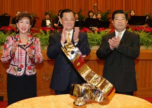 | Jia Qinglin (1st R), chairman of the National Committee of the Chinese People's Political Consultative Conference, poses with Honorary Chairman of the Chinese Kuomintang (KMT) Lien Chan (C) and his wife Lien Fang-yu during a banquet at the Great Hall of the People in Beijing, capital of China, April 14, 2006. Jia hosted the banquet for all participants of the Cross-Straits Economic and Trade Forum, opened in Beijing on April 14. (Xinhua photo) |