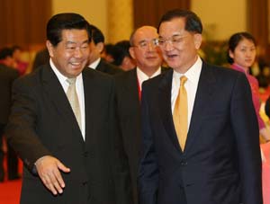 | Jia Qinglin (L), chairman of the National Committee of the Chinese People's Political Consultative Conference, talks with Honorary Chairman of the Chinese Kuomintang (KMT) Lien Chan during a banquet at the Great Hall of the People in Beijing, capital of China, April 14, 2006. (Xinhua photo) |