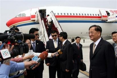 Former Kuomintang honorary Chairman Lien Chan, right, speaks to journalists before boarding the plane in Shanghai, China, on Tuesday April 25, 2006. Lien left here Tuesday for Taiwan after a 13-day visit to the mainland. [Xinhua]