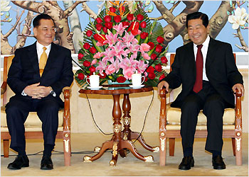 Jia Qinglin (R), chairman of the National Committee of the Chinese People's Political Consultative Conference, meets with Lien Chan, honorary chairman of the Chinese Kuomintang (KMT) party, in Beijing April 14, 2006. [Xinhua Photo] | |