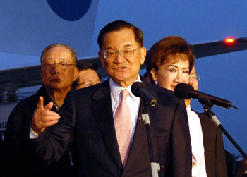 Chinese Kuomintang Honorary Chairman Lien Chan speaks after he and his wife Lien Fang-yu arrive at the airport in Fuzhou April 17. (Photo: Xinhua)