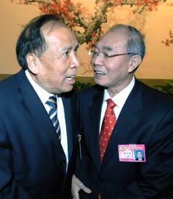 Xiao Zhuoji (R) and Chen Kaizhi, members of the Tenth National Committee of the Chinese People's Political Consultative Conference (CPPCC) talk to each other prior to the meeting at the Great Hall of the People in Beijing March 13, 2006. [Xinhua Photo]