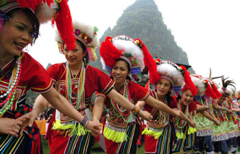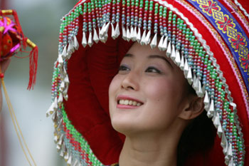 A girl in national attire attends a celebration for the traditional singing festival of the Zhuang ethnic group, in Guilin, a tourist resort in southwest China's Guangxi Zhuang Autonomous Region March 31, 2006. The day of March 3 on the Chinese lunar calendar, which falls on March 31 this year, is a traditional festival celebrated by many nationalities with various methods in China. [Xinhua Photo]