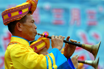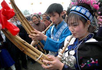 Two young people play Lusheng pipes to celebrate the March 3rd Festival in Yunyan District of Guiyang, capital of southwest China's Guizhou province, on March 31, 2006. [Xinhua Photo]