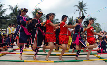 Girls enjoy bamboo pole dance to celebrate the March 3rd Festival in Sanya, a city of south China's Hainan province, on March 31, 2006. [Xinhua Photo]