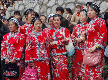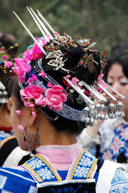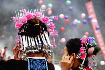 Girls in traditional costume celebrate the March 3rd Festival in Yunyan District of Guiyang, capital of southwest China's Guizhou province, on March 31, 2006. [Xinhua Photo]