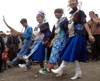 People in traditional costume celebrate the March 3rd Festival in Yunyan District of Guiyang, capital of southwest China's Guizhou province, on March 31, 2006. [Xinhua Photo]