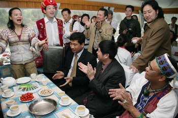 People from southeast China's Taiwan province enjoy local singers' (1st L, 2nd L) performance as they tour on the Lijiang River in Guilin, a tourist resort in southwest China's Guangxi Zhuang Autonomous Region March 30, 2006. [Xinhua Photo]