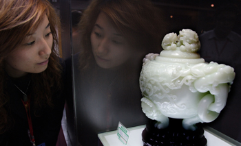 A woman views a jade sculpture worth millions of yuan in Arts and Crafts Building on Wangfujing Street of Beijing, capital of China, June 9, 2006. [Xinhua Photo]