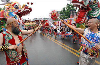 Dancers from the Luxian County of Luzhou City, Sichuan Province, perform folk dragon dance in a ceremony to greet the coming China Cultural Heritage Day in Chengdu, capital of southwest China's Sichuan Province, June 6, 2006. As a way to pray for good weather and harvest, the dance was quite popular during the late Ming Dynasty (1368-1644) and the early Qing Dynasty (1616-1911). It is one of the national intangible cultural heritages of China. [Xinhua Photo]