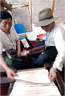 Two technicians from Garse Tibetan Autonomous Prefecture of Sichuan Province perform traditional engraving printing techniques of Tibetans in Chengdu, capital of southwest China's Sichuan Province, June 6, 2006. The technique is one of the national intangible cultural heritages of China. [Xinhua Photo]