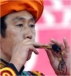 An artist from Aba Tibetan Autonomous Prefecture of Sichuan Province plays Qiang flute in Chengdu, capital of southwest China's Sichuan Province, June 6, 2006. Qiang flute consists of two bamboo pipes bound by strings, which is usually used by Qiang minority living in western China. The performance and production of Qiang flute is one of the national intangible cultural heritages of China. [Xinhua Photo]