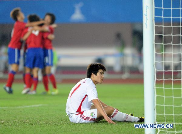 China's Zhao Honglue reacts after South Korea's goal during a quarterfinal match of men's soccer event in the 16th Asian Games in Guangzhou, south China's Guangdong Province, Nov. 15, 2010. China lost 0-3. (Xinhua/Li Gang)