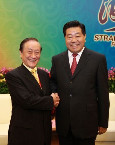 Jia Qinglin (R), member of the Standing Committee of the Political Bureau of the Communist Party of China (CPC) Central Committee and chairman of the National Committee of the Chinese People's Political Consultative Conference (CPPCC), meets with Yok Mu-ming, chairman of Taiwan's New Party, during his meeting with participants of the second Strait Forum in Xiamen, southeast China's Fujian Province, on June 19, 2010(Xinhua/Pang Xinglei)