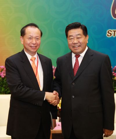 Jia Qinglin (R), member of the Standing Committee of the Political Bureau of the Communist Party of China (CPC) Central Committee and chairman of the National Committee of the Chinese People's Political Consultative Conference (CPPCC), meets with Chin Ching-sheng, secretary-general of Taiwan's People First Party, during his meeting with participants of the second Strait Forum in Xiamen, southeast China's Fujian Province, on June 19, 2010(Xinhua/Pang Xinglei)