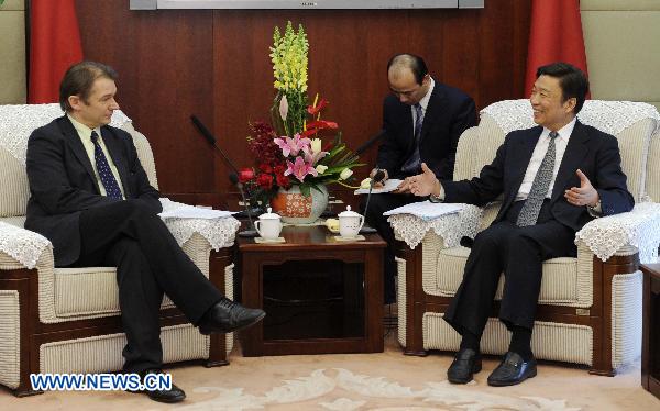 Li Yuanchao (R, front), a member of the Political Bureau of the Communist Party of China (CPC) Central Committee and head of the Organization Department of the CPC Central Committee, meets with Philippe Lamberts, co-spokesperson of the European Green Party and head of a delegation of the European Green Party, in Beijing, capital of China, Feb 23, 2011. [Xinhua]