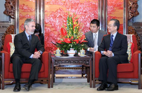 Chinese Premier Wen Jiabao (R Front) meets with Brazilian Foreign Minister Antonio Patriota(L Front) in Beijing, capital of China, March 3, 2011. [Xinhua]