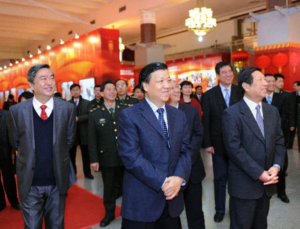 Liu Yunshan (C, front), head of the Publicity Department of the Central Committee of the Communist Party of China (CPC), visits a photo exhibition showcasing China's achievements in the past five years, at the Military Museum of the Chinese People's Revolution in Beijing, capital of China, March 22, 2011. The photo exhibition opened here Tuesday, displaying over 600 pictures categorized in politics, economy, diplomacy, national defence, science, technology, etc. (Xinhua/Liu Jiansheng)