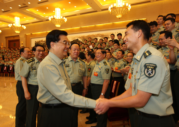 Chinese President Hu Jintao (L, front), also general secretary of the Communist Party of China (CPC) Central Committee and chairman of the Central Military Commission (CMC), meets with delegates of the People's Liberation Army (PLA) attending a seminar on Party building, in Beijing, capital of China, July 24, 2010. (Xinhua/Wang Jianmin)